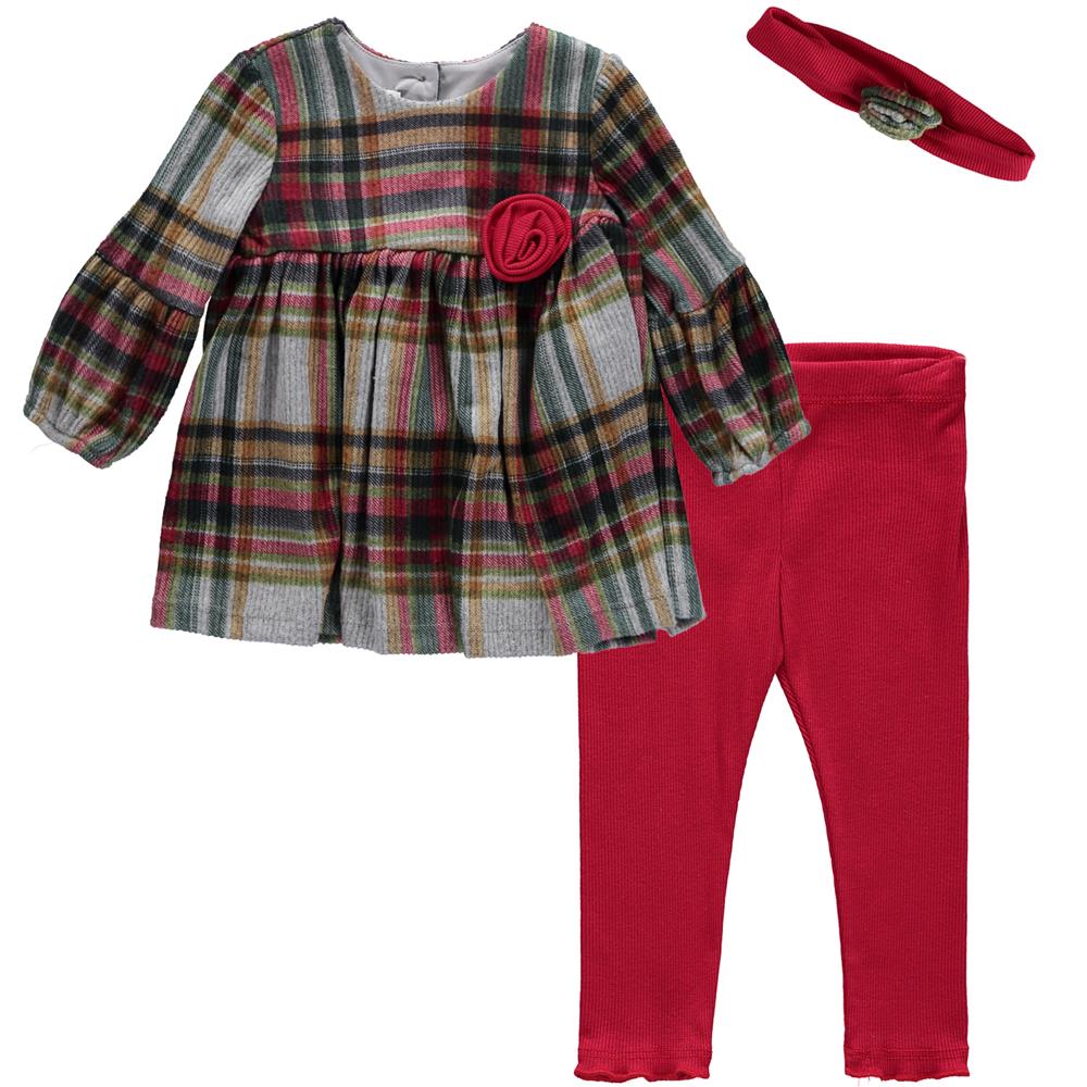 Your little girl will be ready for the holidays with this cute plaid outfit. The tunic top has long sleeves and a cute rosette at the front. Matching leggings have an elastic waist.