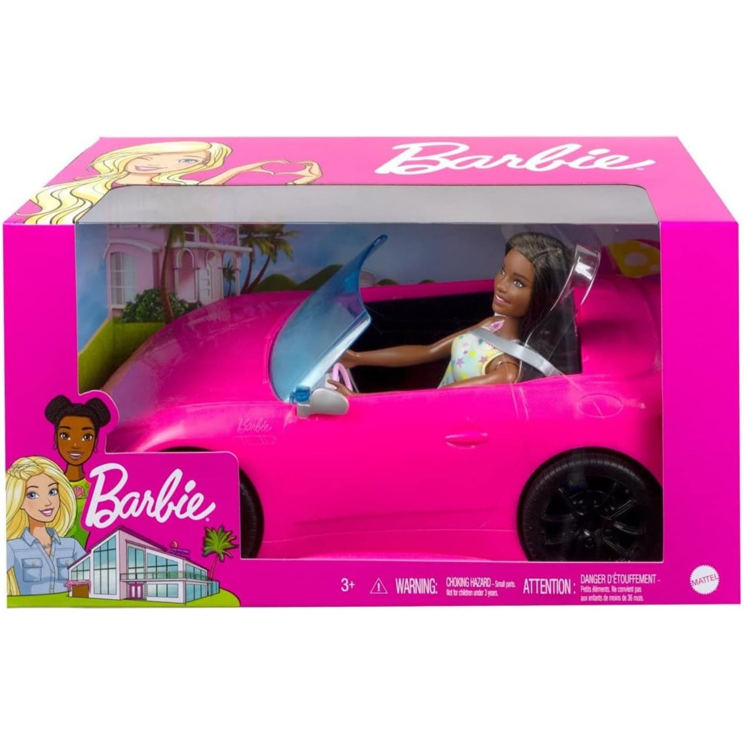 Kids can hit the road to storytelling fun with Barbie® doll and her hot-pink convertible vehicle! This doll and vehicle playset features a stylish, open-top car with a sporty shape, seating for two and realistic details, like a matte black grille and wheels, seatbelts and silvery accents. Fun touches with signature Barbie® style include a personalized license plate and Barbie® silhouette hood emblem. In a trendy dress with a starry print and stylish pink shoes, Barbie® doll is ready for any adventure kids can dream up. Doll cannot stand alone.
