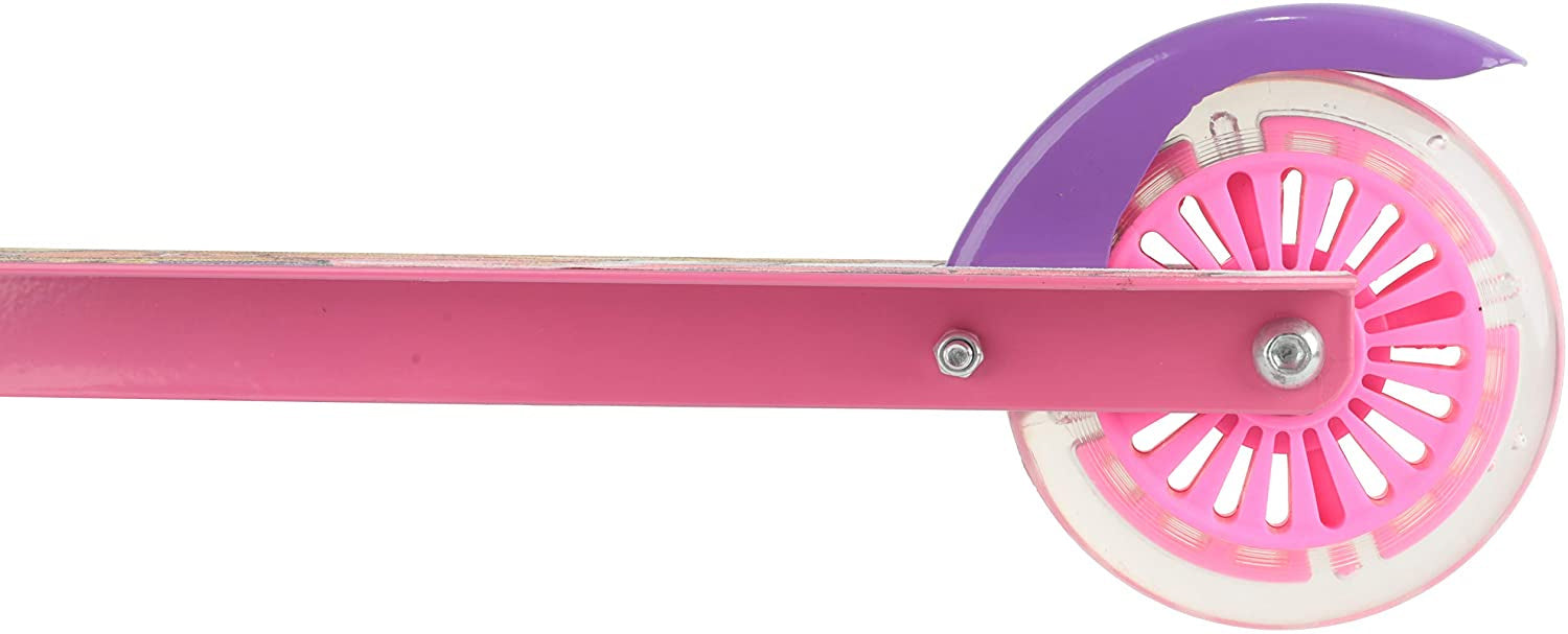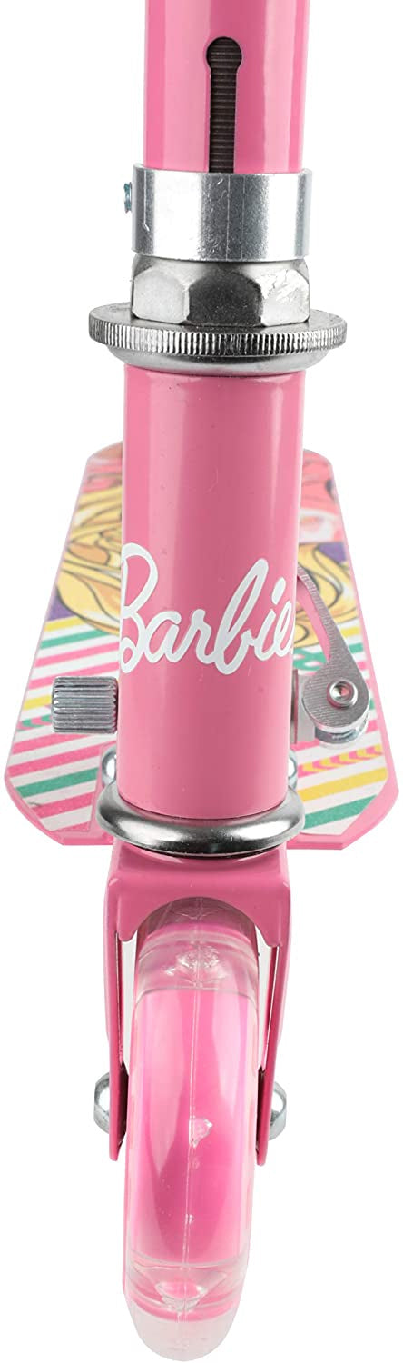 Put on your helmet, kick off and go have fun! Barbie Light Up Wheels Scooter is perfect for tons of outdoor fun adventures. This kick scooter is made out of a strong, light metal deck to keep it lightweight and sturdy for everyday use. It easily folds to a compact size that can fit in cars, trucks, or closets. With rubber grips for a comfortable grasp and a quick stop rear brake as an added layer of safety for those quick decisions.